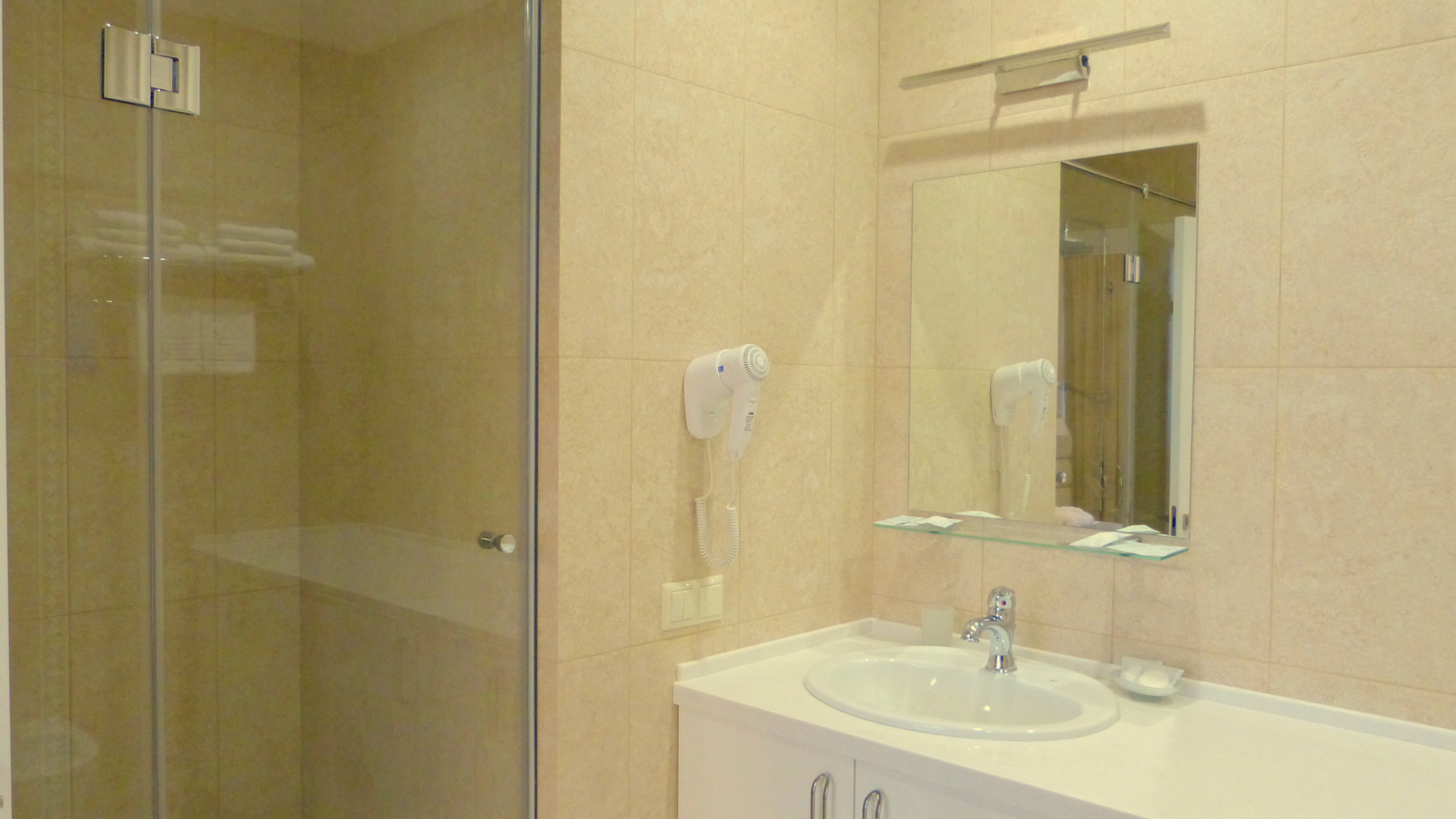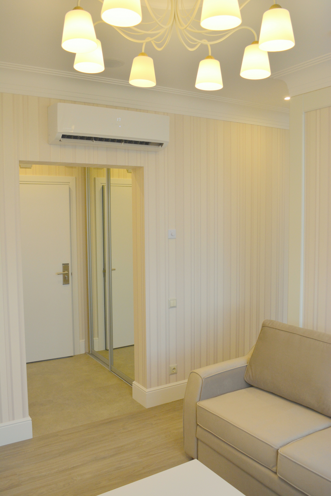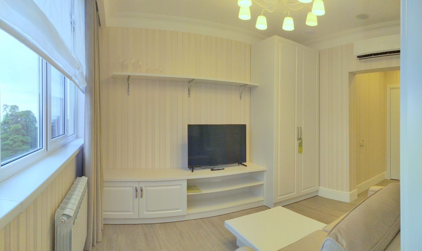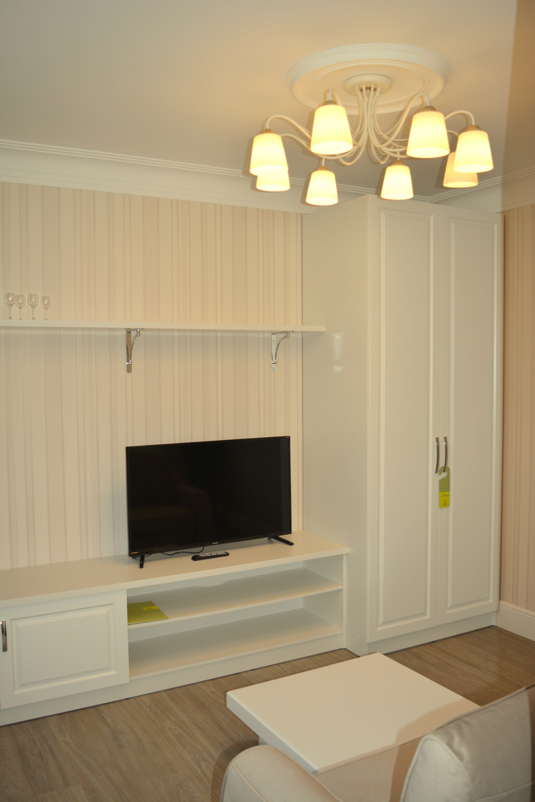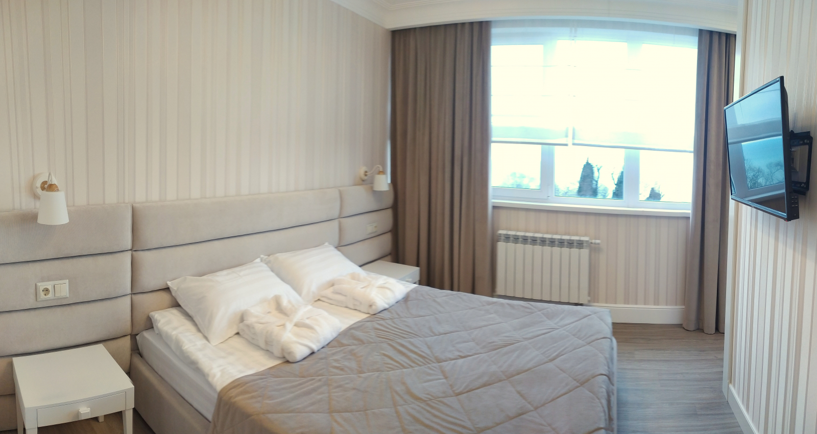 Площадь номера - 33,6 кв.м. 2 осн. места. 2 доп. места. Мебель: диван, кровать двуспальная, прикроватные тумбочки, шкаф встроенный. Оборудование: гладильная доска, кондиционер, набор посуды, стиральная машина, телевизор, телефон, теплый пол, утюг, холодильник, электрочайник. Санузел: с душем, туалетные принадлежности, фен, халат. Сервис: смена полотенец (по требованию в первой половине дня), смена постельного белья (1 раз в 3 дня), уборка номера (ежедневно), услуги телефонной связи по территории отеля.